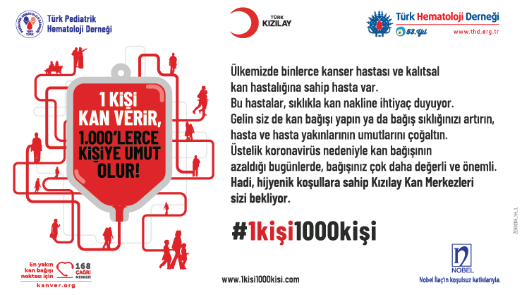 1kişi1000kişi projesi 8 Mayıs 2021 Talasemi Günü odağında Nobel İlaç, Türk Kızılay, Türk Hematoloji Derneği ve Türk Pediatrik Hematoloji Derneği işbirliği ile ‘1 kişi kan verir, 1000’lerce kişiye umut olur’ sloganı kullanılarak hayata geçirildi. 1kişi1000kişi projesi ile COVID-19 pandemisi nedeniyle kan bağışı sayılarındaki azalmaya dikkat çekilerek kan bağışında bulunmak isteyen bireyleri Türk Kızılay Kan Bağışı Merkezleri’ne davet etmek ve kan bağış sayılarında artış sağlamak amaçlanıyor.