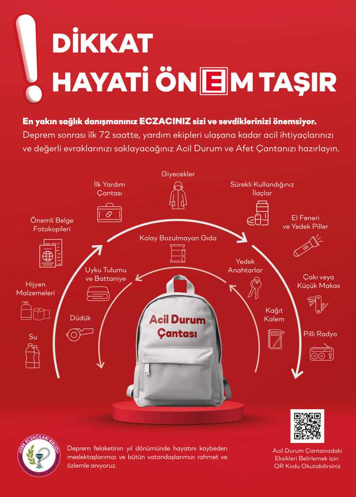 Türk Eczacıları Birliği olarak bu amaçla, depremin birinci yılında vatandaşlarımızın olası bir deprem felaketine karşı hazırlıklı olması için bir farkındalık çalışmasını da başlattık. Olası bir deprem sonrasında, ilk 72 saatte yardım ekipleri ulaşıncaya kadar hayati önem taşıyan acil durum çantalarının içeriğini gösteren “Acil Durum Çantasında Neler Olmalı?” afişlerini hazırladık ve ülke çapındaki bütün eczanelerimize dağıttık.