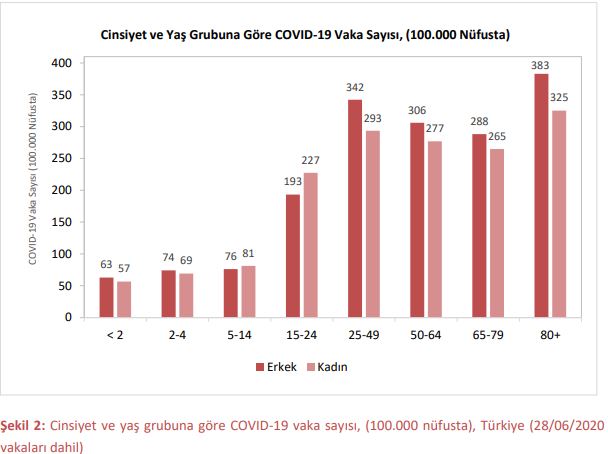Bildirilen vakaların %48’i kadın, %52’si erkektir. Vakaların 14.388’i 15 yaş ve altı çocuklarda (%7,3), 27.199’u 15-24 yaş arasında (%13.7), 98.032’si 25-49 yaş grubunda, 36.777’si 50-64 yaş arasında, 16.672’si 65-79 yaş grubunda gerçekleşmiş olup 5.215’i 80 yaş ve üzerindedir (%2,6). Onaylanan vakaların içinde yaşı bilinmeyen sadece 1 vaka mevcuttur. 100.000 kişiye düşen en yüksek COVID-19 vaka sayısı 80 yaş ve üzeri bireylerde görülmüştür.