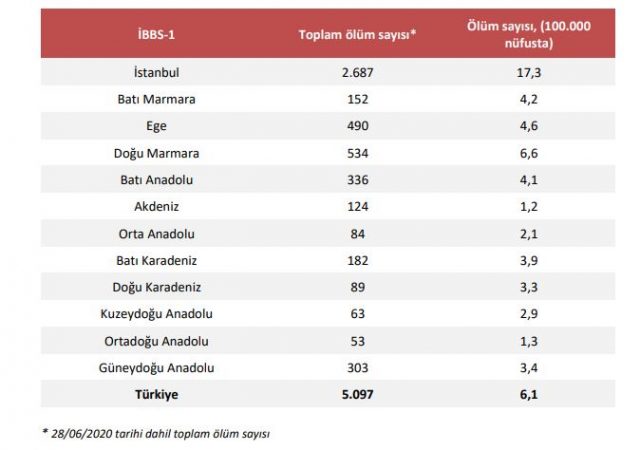 Sağlık Bakanlığı tarafından Türkiye’nin corona virüsü durum raporu yayımlandı. Raporda 28 Haziran tarihi dahil, İstanbul ve bölgelerin toplam ölüm sayısı da açıklandı. Buna göre, İstanbul’da toplam ölüm sayısı 2 bin 687, Doğu Marmara’da 534, Ege’de 490, Batı Anadolu’da 336, Güneydoğu Anadolu’da ise 303 oldu.