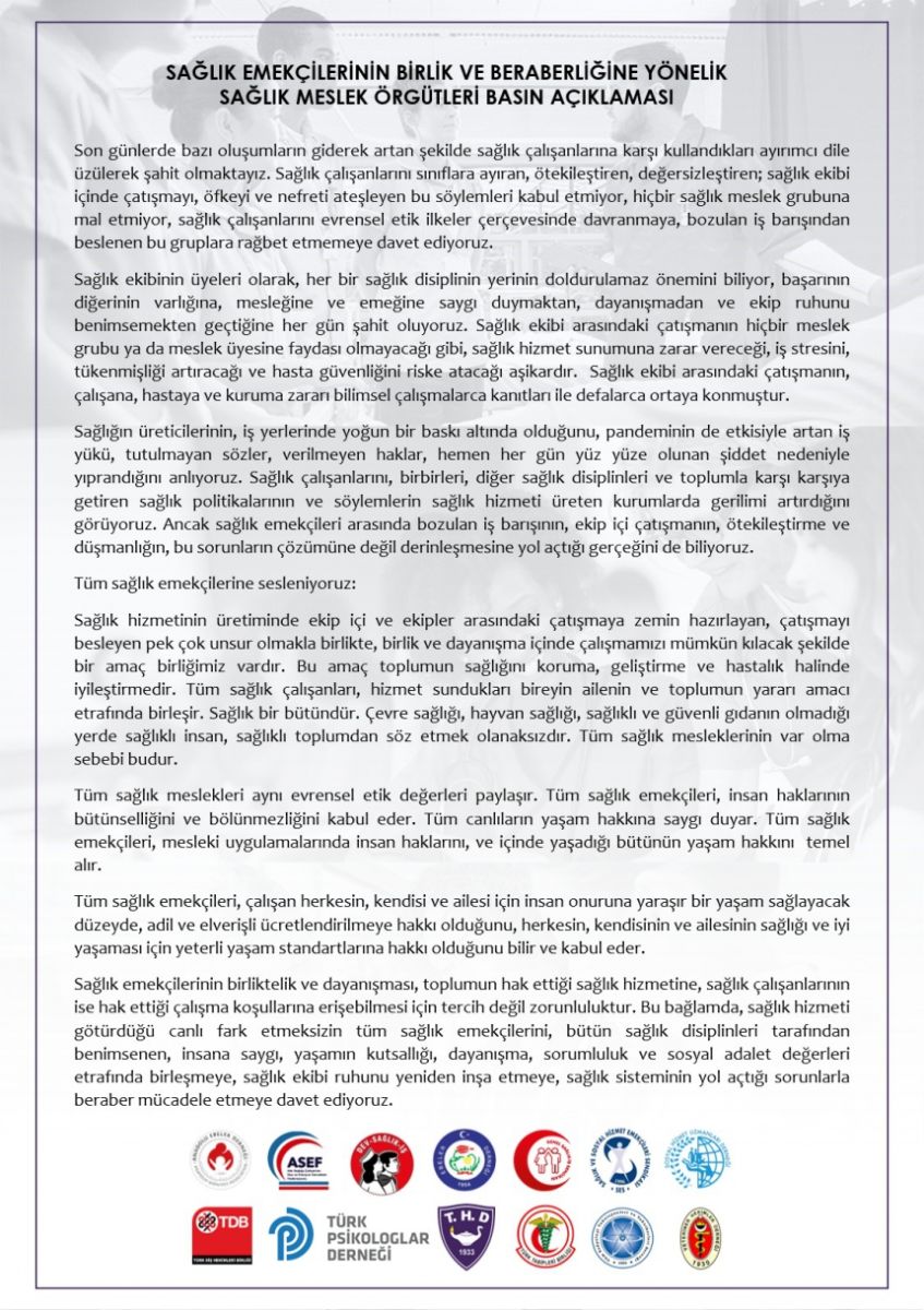 Ana Sayfa Hukuk&Etik Birlik ve Beraberlik AçıklamasıHukuk&EtikManşetBirlik ve Beraberlik AçıklamasıYazar winally - 22 Şubat 2022Sağlık Emekçilerinin Birlik ve Beraberliğine Yönelik Sağlık Meslek Örgütleri Basın Açıklaması: Please follow and like us: