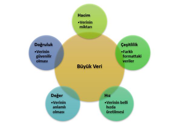 Ancak büyük veriden bahsedebilmek için tek başına büyük hacimli olması yetmez. Bunun yanında diğer özelliklerin de aynı anda karşılanması gerektiği daha önce ifade edilmişti. Tam anlamıyla büyük veriden bahsedebilmek için literatürde yaygın bir şekilde kabul gören belli başlı özelliklere sahip olması gerekir. Bu özellikler aynı zamanda kısaca 5V olarak anılmakta olup şöyledir: