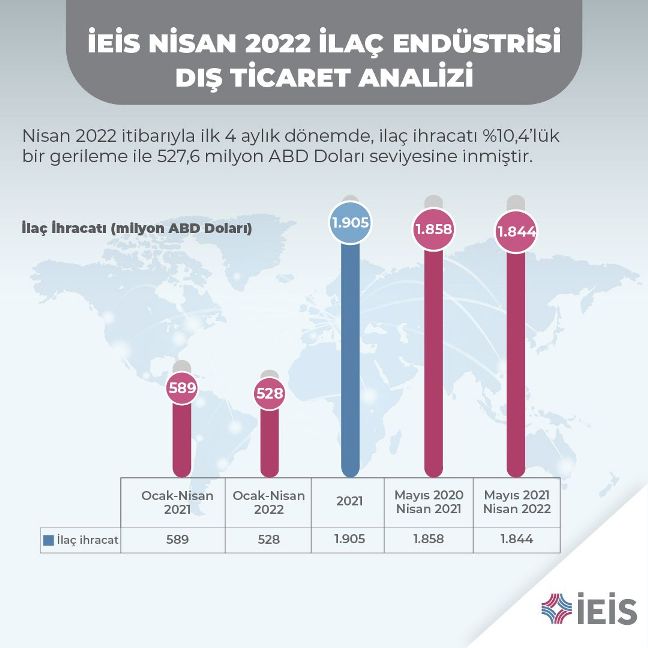 TÜİK genel ticaret sistemi hesap yöntemine göre 2022 yılı Nisan ayında ilaç ihracatı aylık bazda 2021 yılının aynı ayına göre %0,7 artışla 169,8 milyon ABD Doları seviyesinde gerçekleşmiştir. 2021 yılının son aylarında yaşanan aşırı kur hareketliliğinin etkisi devam ederek Nisan ayında da ilaç ithalatı %3,5 oranında gerilemiş ve 512,4 milyon ABD Doları seviyesine inmiştir. İlaç ihracatının ithalatı karşılama oranı ise %33,1 seviyesinde gerçekleşmiştir.