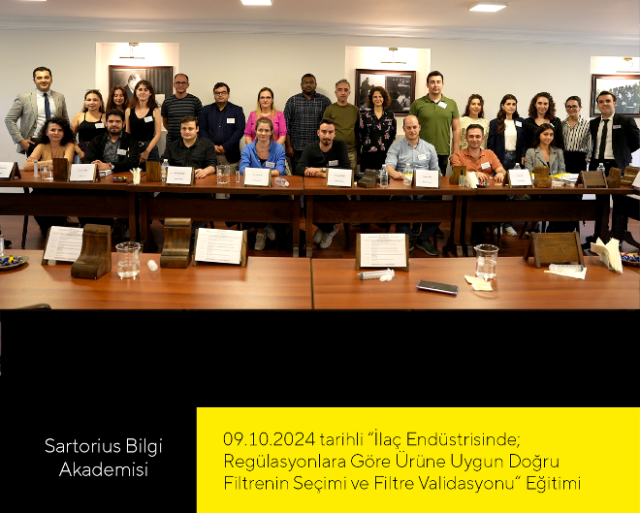 İlaç endüstrisinin bilgi alışverişi için bir merkez haline gelen Sartorius Bilgi Akademisi bu kez Filtre Validasyonu Eğitimi için kapılarını açtı. İlaç profesyonelleri 9 Ekim’de Kadıköy-Koşuyolu’nda yer alan akademi binasında “İlaç Endüstrisinde Regülasyonlara Göre Ürüne Uygun Doğru Filtre Seçimi ve Filtre Validasyonu” eğitimi için bir araya geldi.