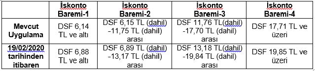 Söz konusu düzenlemelere istinaden 24/03/2013 tarihli ve 28597 sayılı Resmî Gazete’de yayımlanan Sosyal Güvenlik Kurumu Sağlık Uygulama Tebliğinde (SUT) değişiklik yapılıncaya kadar SUT’un “4.4.1 – Uygulanacak indirim oranları” maddesinde yer alan iskonto oranları için belirlenen baremlere ait 19/02/2020 tarihinden itibaren uygulanan depocuya satış fiyatları (DSF) aşağıda yer almaktadır.