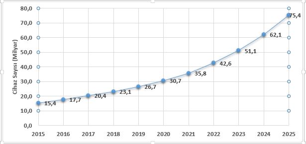 Nesnelerin internetiyle bağlı olan cihaz sayısı her geçen saniye artış göstermektedir. Statista’nın raporuna göre, 2025’nin sonuna kadar 75 milyar bağlı akıllı telefon, giyilebilir, akıllı saat, araba ve diğer cihazlar nesneler interneti aracılığıyla birbirine bağlı olması tahmin edilmektedir. Şu anda, bu sayı dünya çapında yaklaşık 31 milyar cihazla sınırlıdır. Bu istatistikler IoT’nin ne kadar katlanarak büyüdüğünü göstermektedir. Nesnelerin internetiyle bağlı olan ve olacak cihaz sayısı yıllara göre Şekil 1’de verilmiştir.