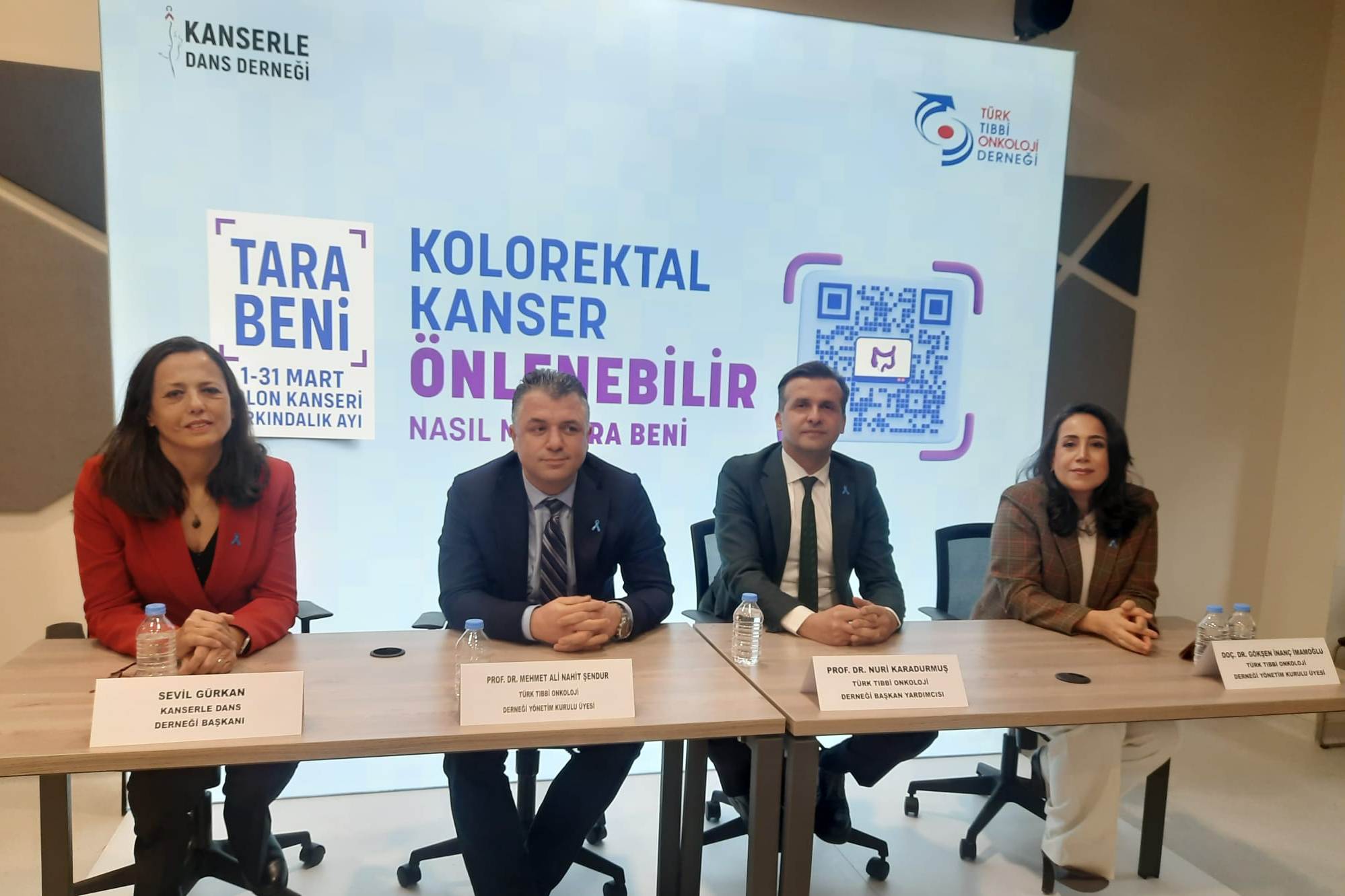 1-31 Mart Kolorektal Kanser farkındalık ayı kapsamında düzenlenen basın toplantısında bir araya gelen Türk Tıbbi Onkoloji Derneği Başkan Yardımcısı Prof. Dr. Nuri Karadurmuş, Türk Tıbbi Onkoloji Derneği Yönetim Kurulu Üyesi Prof. Dr. Mehmet Ali Nahit Şendur, Türk Tıbbi Onkoloji Derneği Yönetim Kurulu Üyesi Doç. Dr. Gökşen İnanç İmamoğlu ve Kanserle Dans Derneği Başkanı Sevil Gürkan, kolorektal kanseri gelişmeden önleyebilmek için tarama programlarına vurgu yaptı.