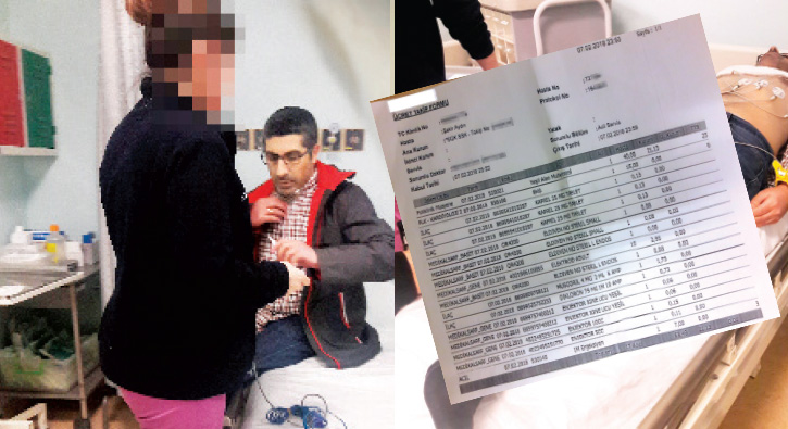 Hastanenin ücret takip formunda EKG ücreti 15 TL olarak yansıtıldı. Aydın’ın çektiği ağrıları nedeniyle sıkıntısını dile getirmesi üzere kas gevşetici iki adet ilaç kullanılarak tek bir kez enjeksiyon işlemi yapıldı. Ancak Hasta Ücret Takip Formu’nda bu işlem için 4 adet medikal malzeme girişi yer aldı.