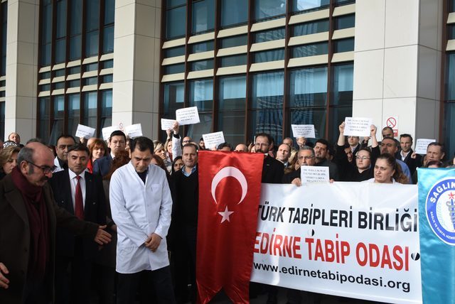 Edirne Tabip Odası öncülüğünde sağlık sendikaları ve çalışanları Sultan 1’inci Murat Devlet Hastanesi’nde, ölen bir hastanın yakınlarının tokat ve yumruklu saldırısına uğrayan evli ve 2 çocuk annesi Dr. Tuba Çıkmaz’a destek için eylem düzenledi. Hastane girişindeki eyleme hastanedeki sağlık çalışanları ile Edirne Tabip Odası üyelerinin yanı sıra Türk Sağlık-Sen, Aile Hekimleri Derneği, Diş Hekimleri Odası, Eczacılar Odası, Sağlık ve Sosyal Hizmet Emekçileri Sendikası Edirne temsilcileri katıldı. Edirne Tabip Odası Başkanı Ertuğrul Tanrıkulu, çok üzgün olduklarını ifade ederek, “Her şeyden önce çok kırgınız. Sağlık çalışanları olarak bir umudu yeşertmenin mutluluğu içerisindeyiz. Sağlık örgütleri, çalışanlar bugün ne yazık ki yaşadığımız acı olayı protesto etmek ve kızgınlığımızı göstermek için buradayız. Sağlık hizmeti verirken, kendimizden, ailelerimizden ödün veriyoruz. Yaşamı savunan meslek erbabı olarak da gerçekten de çok zor durumdayız. Bu şiddet sona ersin diyoruz” dedi.