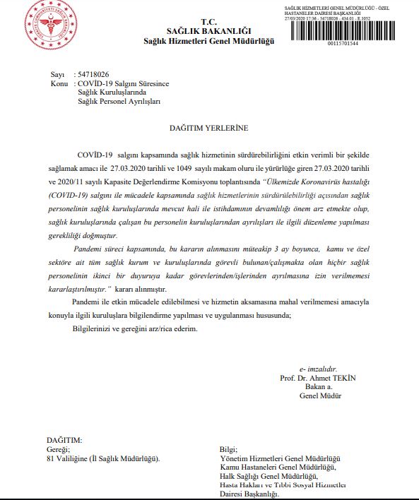 Pandemi süreci kapsamında bu kararın alınmasını müteakip 3 ay boyunca, kamu ve özel sektöre ait tüm sağlık kurum ve kuruluşlarında görevli bulunan/çalışmakta olan hiçbir sağlık personelinin ikinci bir duyuruya kadar görevlerinden/işlerinden ayrılmasına izin verilmemesi kararlaştırılmıştır.
