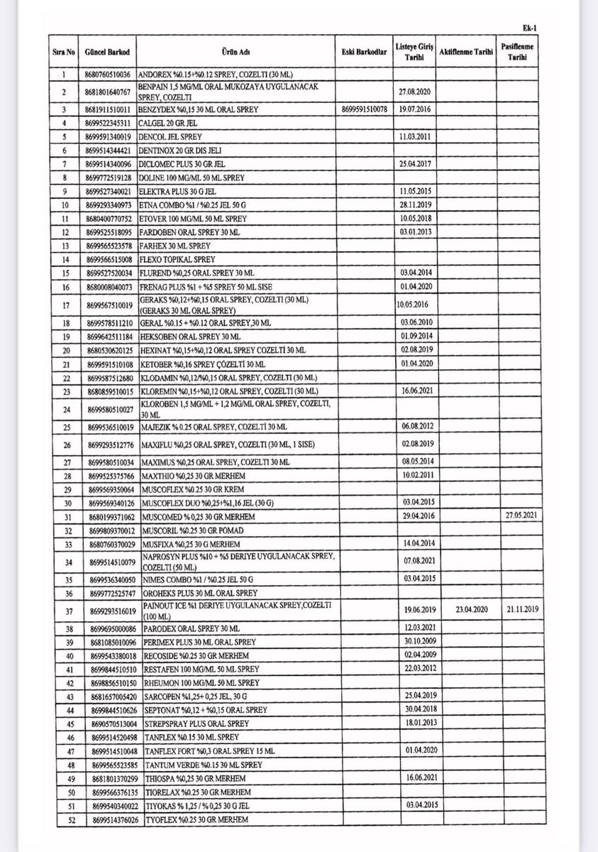 8 Eylül 2021 tarihli 31592 sayılı Resmi Gazete’de “Sosyal Güvenlik Kurumu Sağlık Uygulama Tebliğinde Değişiklik Yapılmasına Dair Tebliğ” yayımlanarak bazı ilaçlar geri ödeme listesinden çıkarıldı.