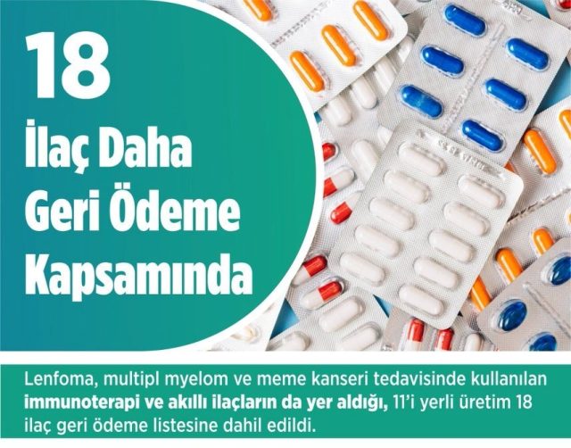 Düzenlemeyle lenfoma, multipl myelom ve meme kanseri tedavisinde kullanılan immunoterapi ve akıllı ilaçların da yer aldığı 11’i yerli üretim 18 ilaç daha geri ödeme listesine dahil edildi.