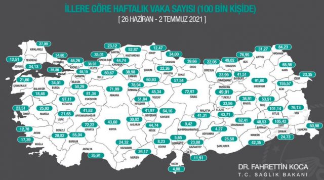 İllerimizde 100.000 nüfusa karşılık gelen bir haftalık toplam vaka sayısını gösteren insidans haritasının güncel halini ekte görebilirsiniz. Salgının sonu aşı ile geliyor. Yarına bugünden daha güvenli bakabilmek için aşınızı olun. pic.twitter.com/Zq768qVpYb