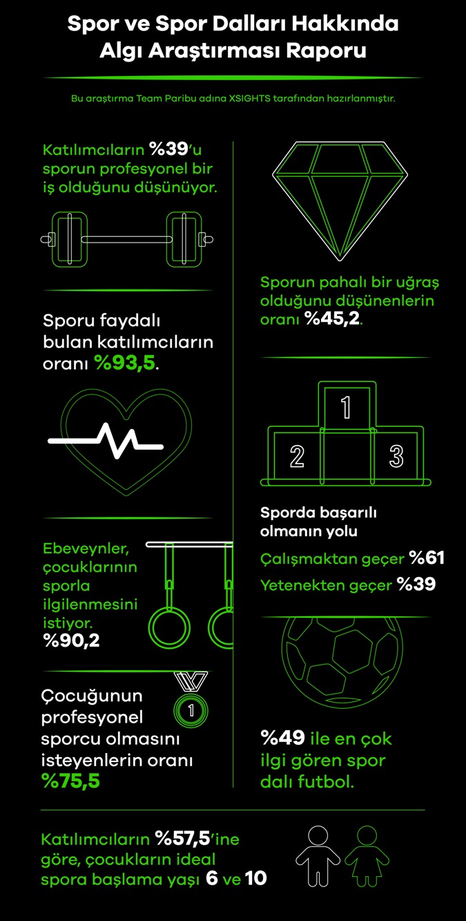 Paribu, Türk sporuna ve sporcularına destek olmak için oluşturduğu Team Paribu’nun desteklediği spor dallarına dair genel çerçeveyi ortaya koyabilmek amacıyla “Paribu Spor ve Spor Dalları Algı Araştırması”nı gerçekleştirdi. Araştırmada; spora ve lisanlı spor yapmaya yönelik tutumlar, Türkiye’de ön planda olan sporlar, ailelerin çocuklarının kariyerlerine spor tarafında devam etmesi yönündeki düşünceleri, sporda kariyer yapma konusundaki algılar, spor dallarına göre cinsiyet algısı, Türkiye’nin 7 bölgesi arasında spora ve sporculara olan bakış arasındaki farklar gibi konu başlıkları detaylıca analiz edildi.