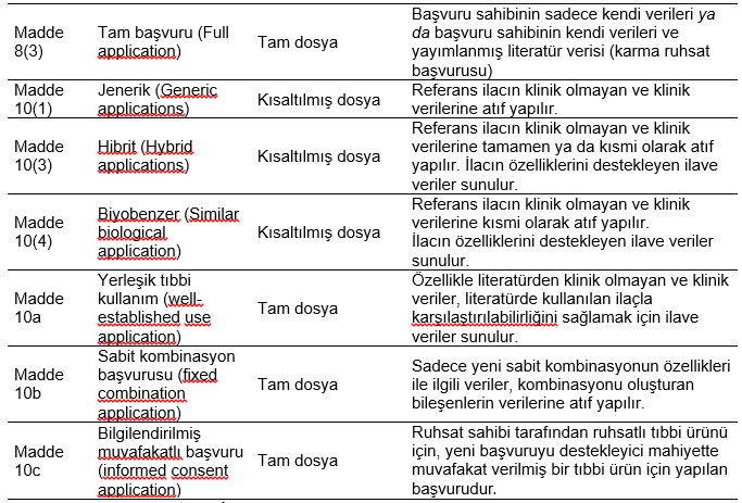 Tablo 2. EMA tarafından uygulanan, 2001/83/AT sayılı direktife göre ruhsat başvuru türleri