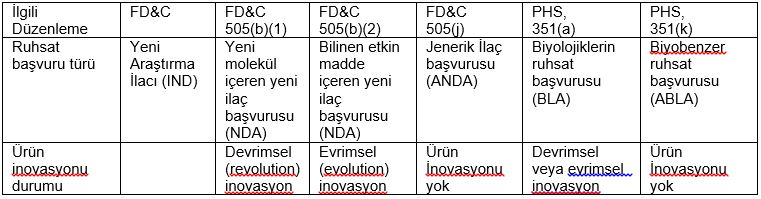 Tablo 1. FDA tarafından uygulanan, geliştirme yöntemlerine göre ilaç ruhsat başvuru türleri