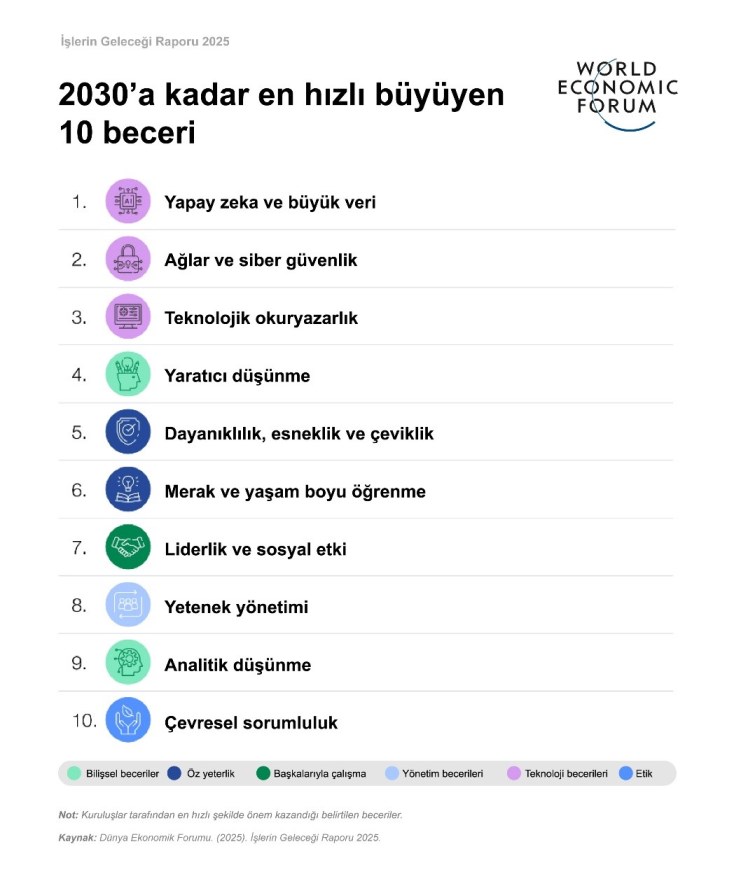İşverenler, Türkiye’de 2030 itibarıyla iş başında gereken becerilerin %44’ünün değişeceğini tahmin ediyor; bu oran, küresel ortalama olan %39’un üzerinde seyrediyor. Yapay zekâ ve büyük veri, teknolojik okuryazarlık ile siber ağ ve güvenlik, ülkede en hızlı büyümesi beklenen beceriler olarak gösteriliyor. Bunun yanı sıra, çok dilli yetkinliklerin öneminin de küresel ortalamaya göre daha yüksek bir artış göstermesi dikkat çekiyor.