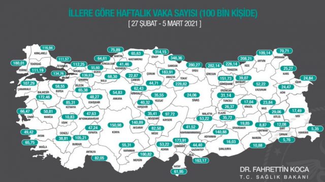 Kontrollü normalleşme için illerimizin 100.000 nüfusa karşılık gelen haftalık vaka sayılarını içeren insidans haritasının güncel hali ektedir.